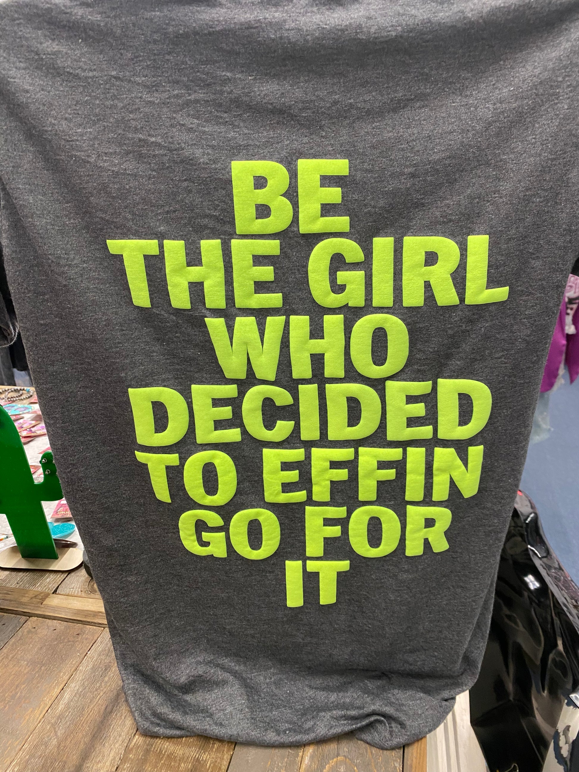 The Be The Girl Who Decided To Effin Go For It Tee is a unique statement piece, constructed from neon and puff material for a bold look. Show off your outgoing personality with this eye-catching fashion piece.