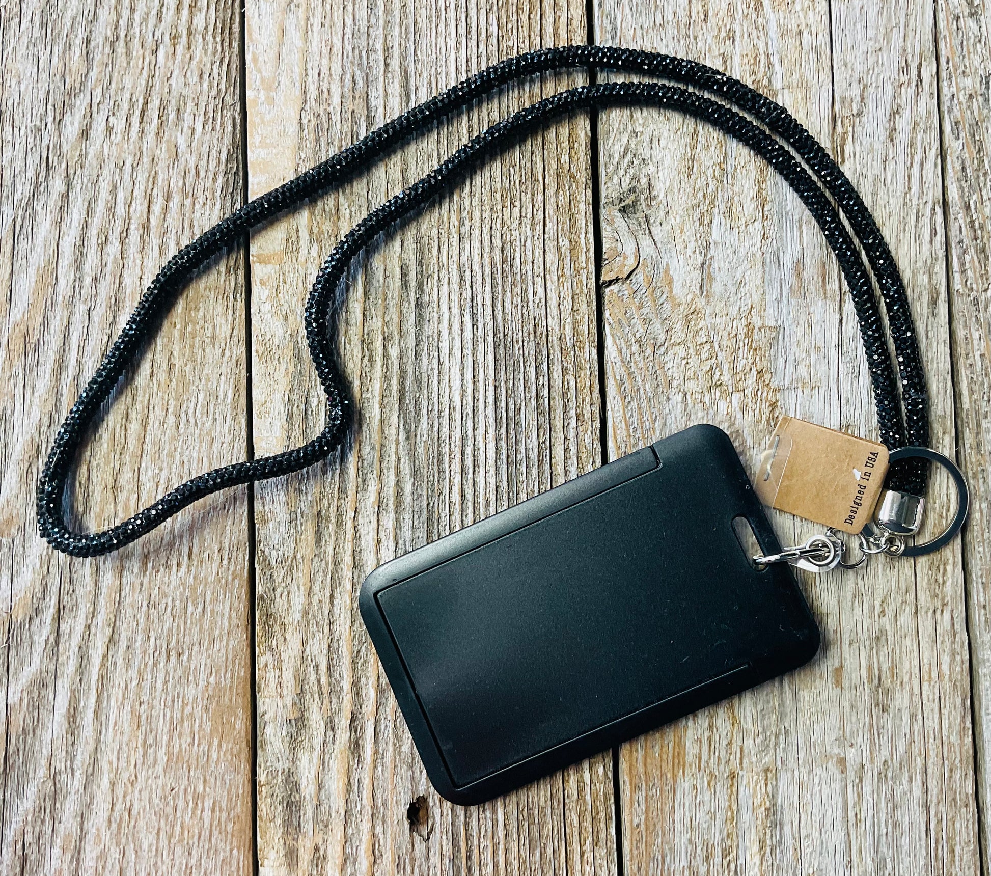 Effortlessly carry your ID with this sleek Black Rhinestone Laynard. The strong laynard securely holds your ID, keeping it easily accessible for quick identification. Say goodbye to fumbling with wallets or bags, and always have your ID at hand with this stylish and practical accessory.