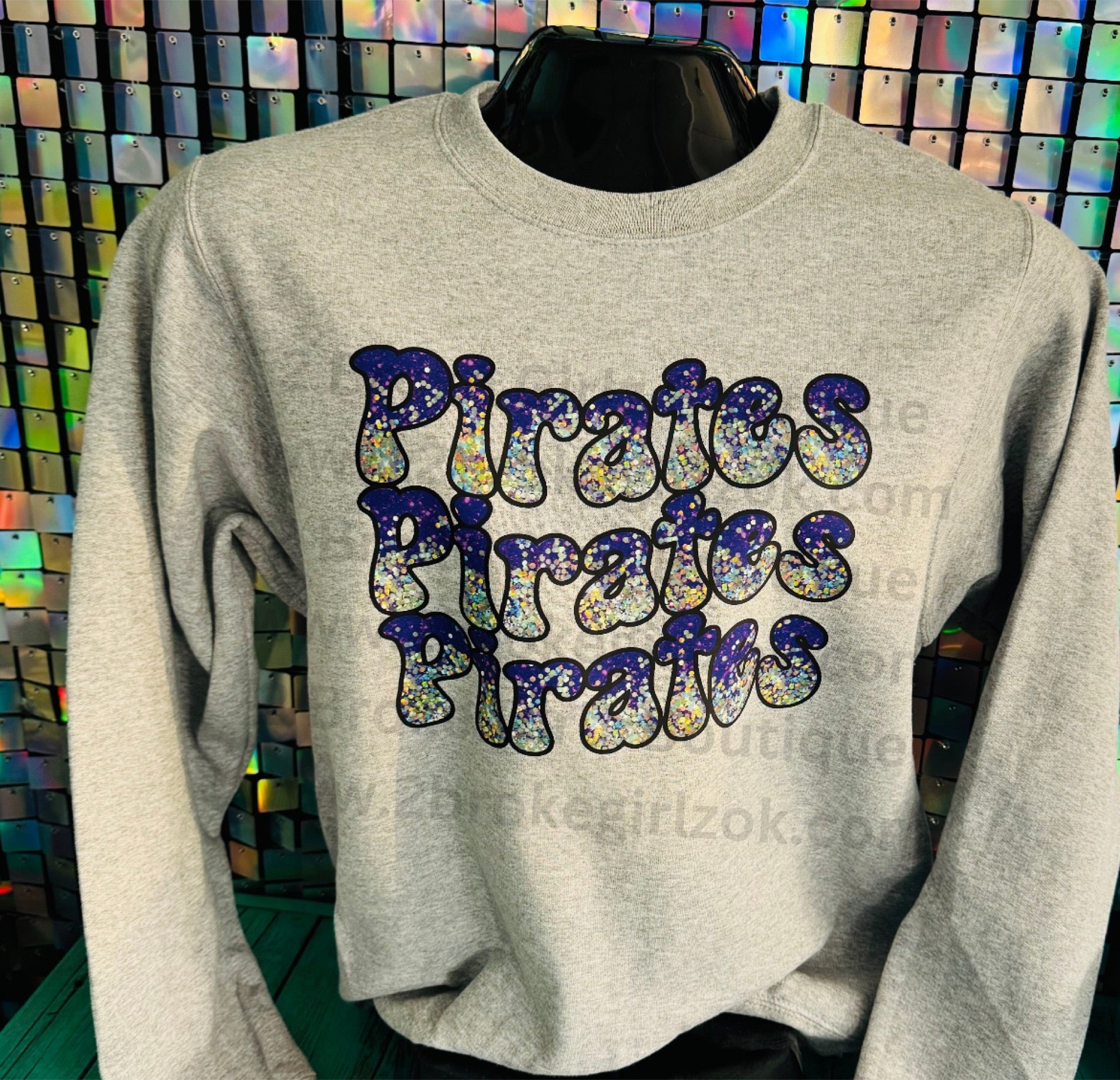 Ahoy mateys, adorn yourself in the fierce and flashy Bristow Pirates Faux Glitter Pirate Game Day Crewneck! Command the game with dazzling style.