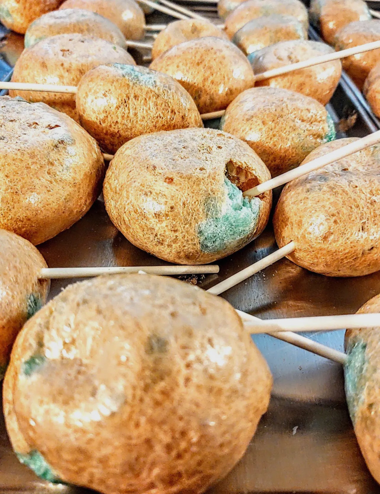 Green Apple candy inside that expands and becomes the texture of a big puffy Cheeto with crunchy light caramel on the outside!