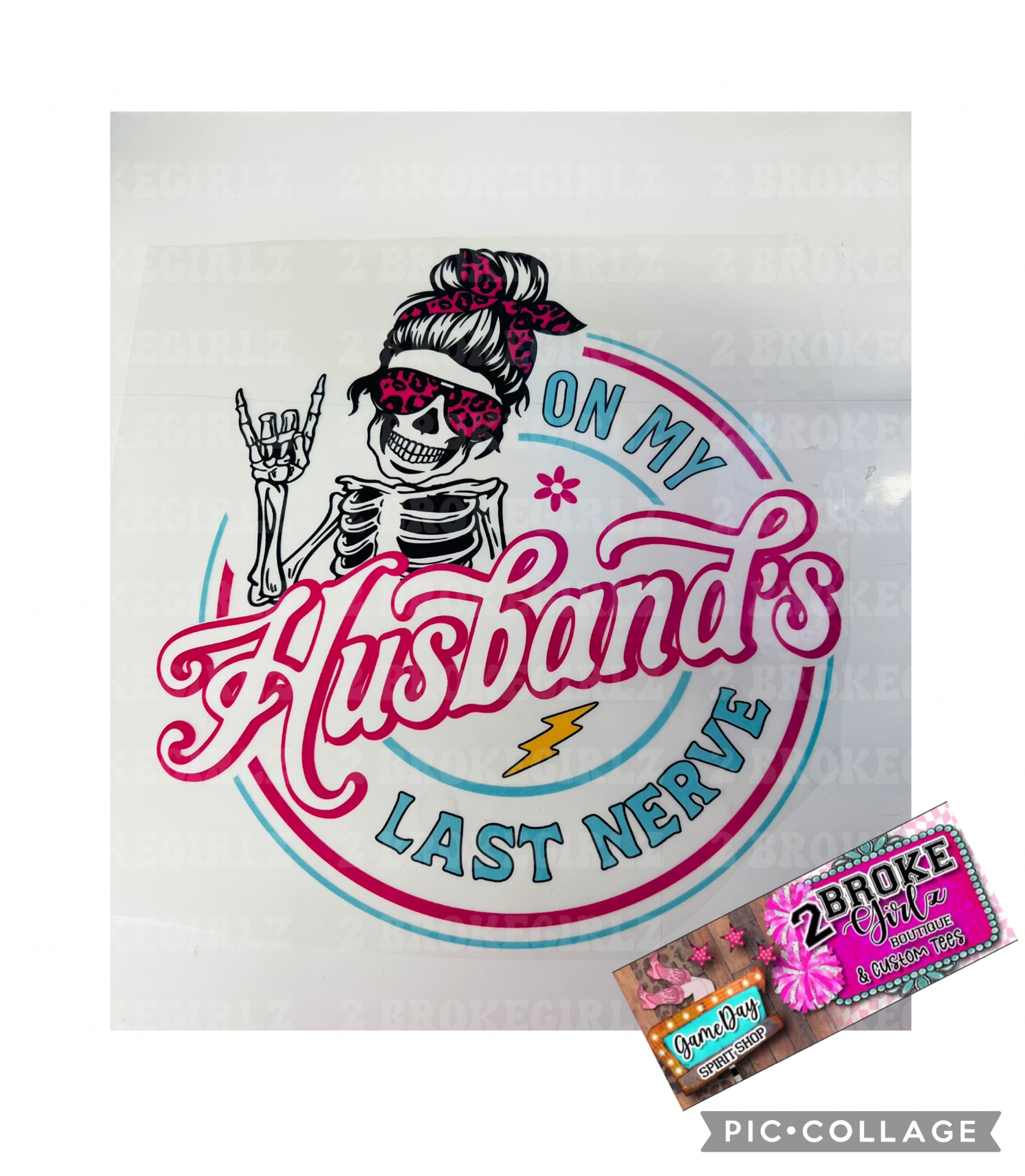 Show off your humorous side with DTF On My Husband's Last Nerve shirt transfer. Perfect for a quirky couple looking to add some playful attitude to their wardrobe.