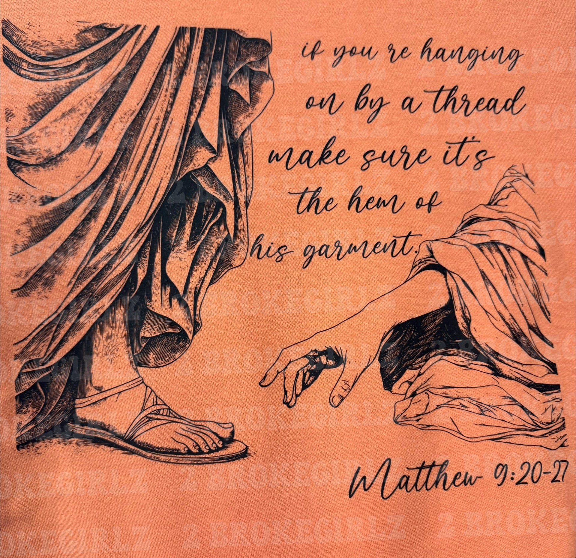 This Faith Graphic Tee features the words "If you re hanging on by a thread make sure it's the hem of his garment" from Matthew 9:20-27. Perfect for believers in need of inspiration and hope. Made from comfortable materials for everyday wear.