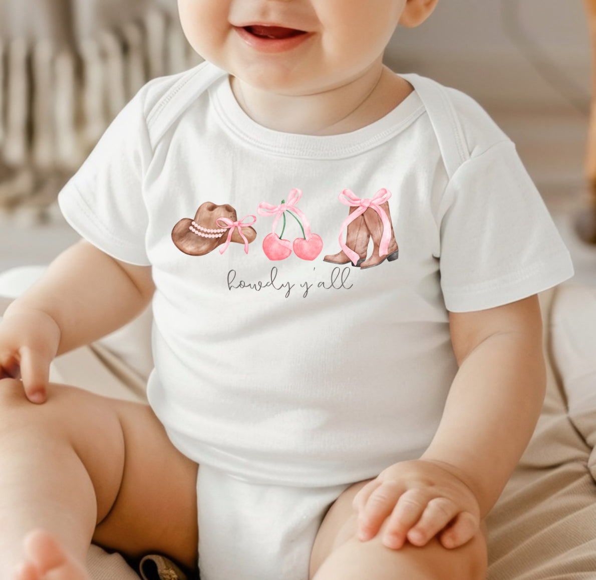 Introducing the Howdy Y’all Onesie. This Western-inspired Onesie combines style and comfort for your little one. Made with high-quality materials, it features a classic design that is perfect for any occasion. Give your child a touch of the Wild West with this adorable onesie.