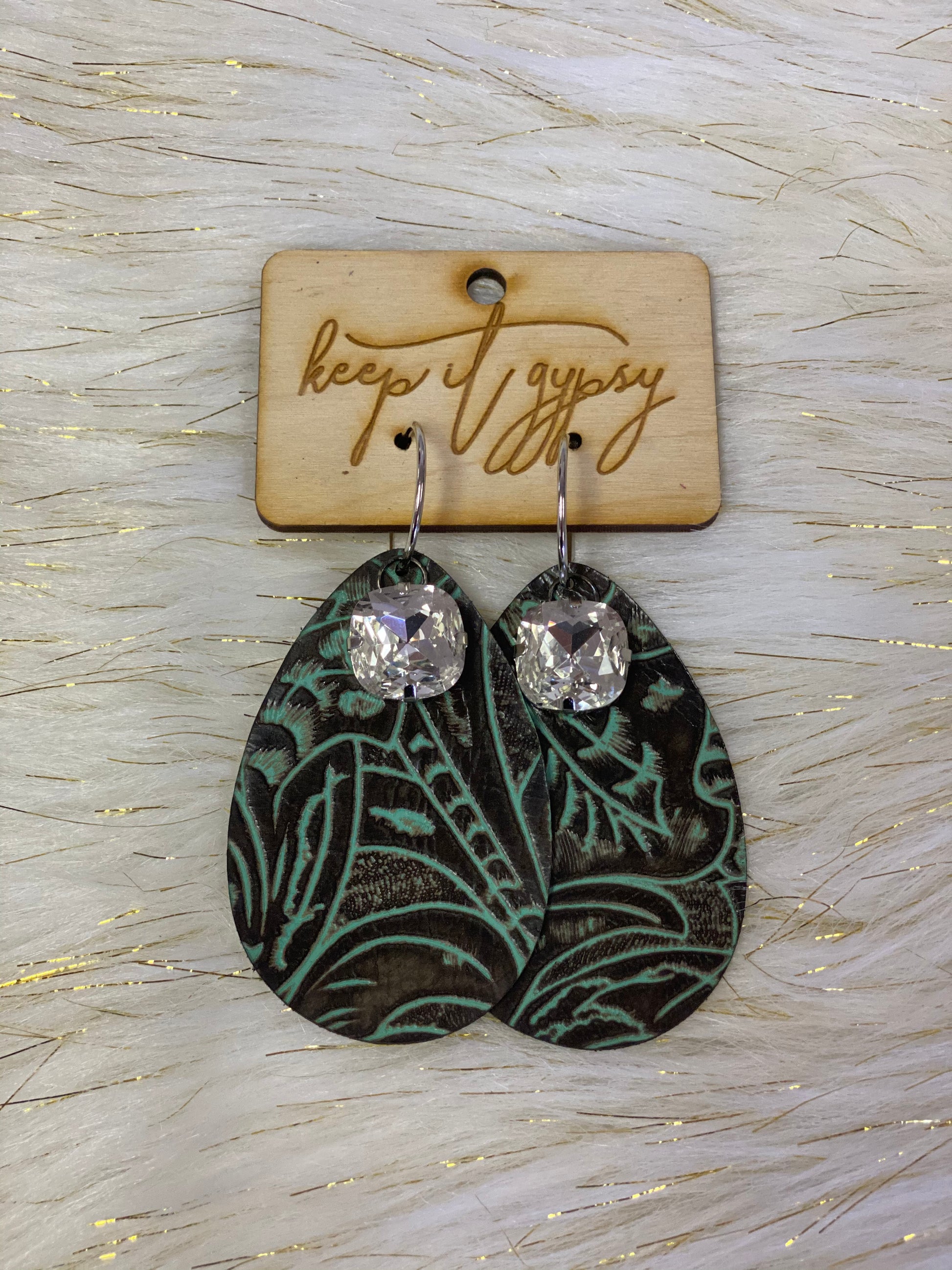 These Keep It Gypsy earrings feature beautiful turquoise with an iridescent jewel for an eye-catching accent. The turquoise leather adds a unique pop of color, while the iridescent jewels add a lovely sparkle. This combination of stones creates a beautiful and sophisticated style.