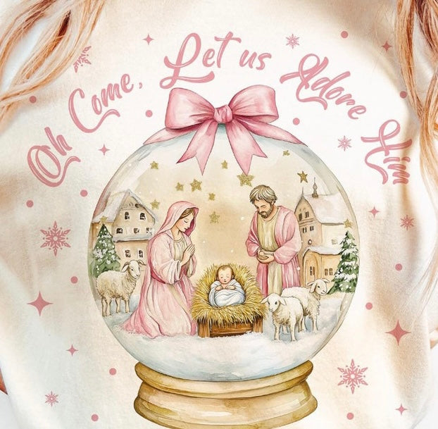 Capture the spirit of the season with our Oh Come Let Us graphic Tee. Featuring the classic lyrics "Oh come, let us adore him", this shirt is perfect for spreading holiday cheer. Made with high quality material, this comfortable Tee is a must-have for any Christmas celebration.
