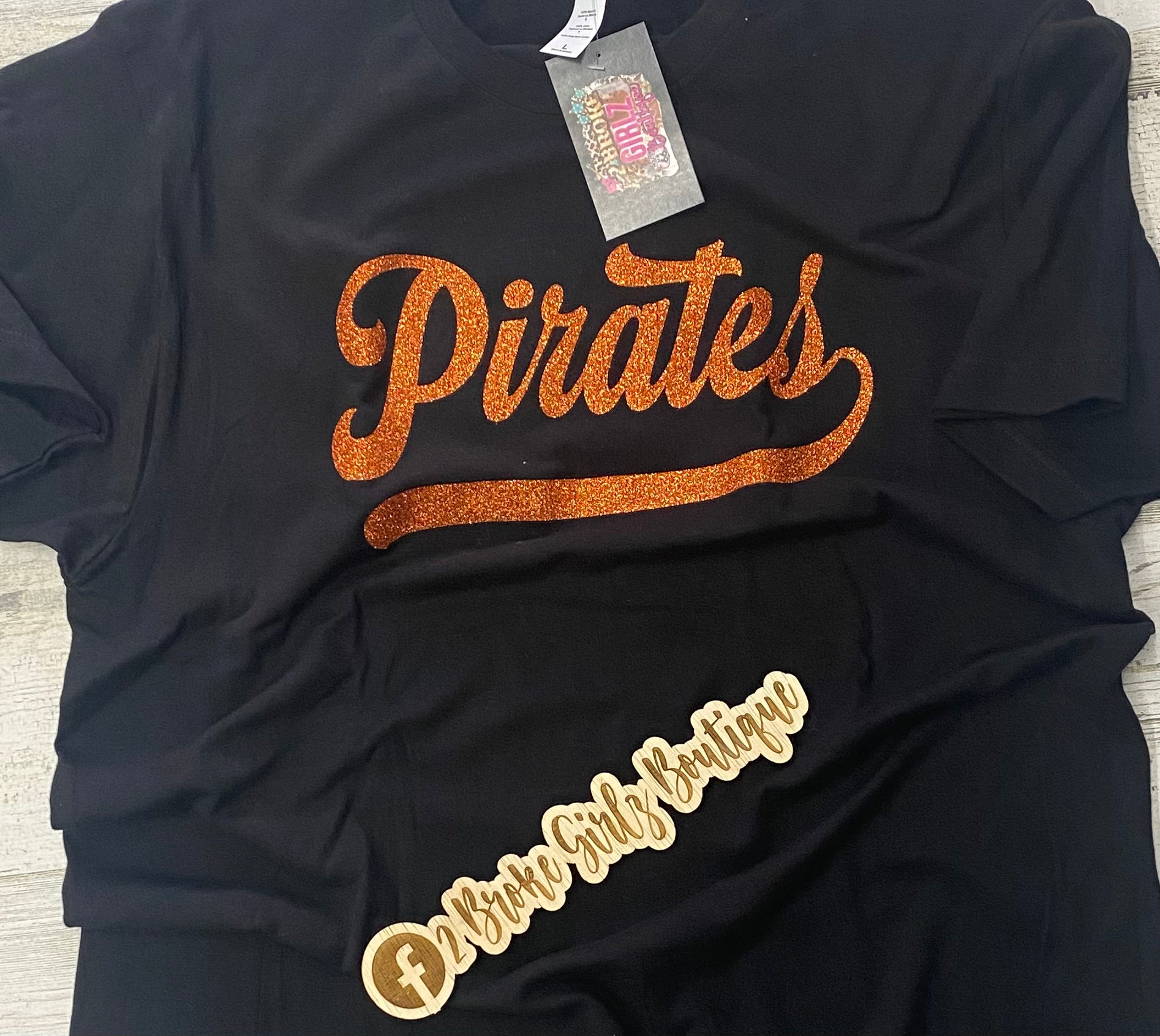 Show your team spirit in style with this Game Day Pirates Glitter Tee. The official black tee features a striking glitter print Pirate crest so everyone knows where your loyalty lies. Perfect for supporting your team on game days.