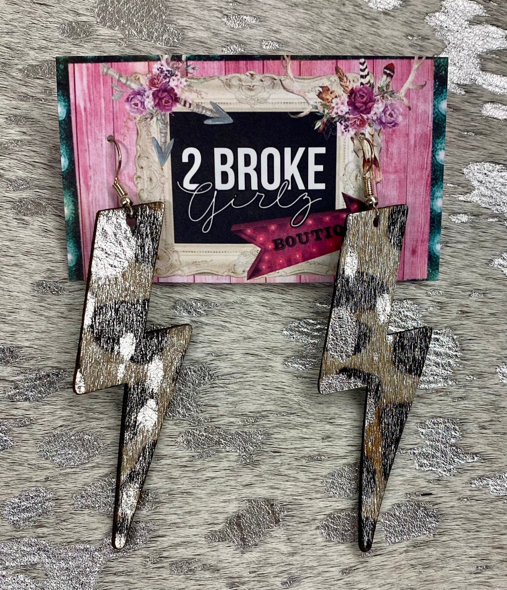 Take your look to the next level with these daring Leopard Lightning Bolt Earrings! Crafted from hide on hair with a bold lightning bolt style, these earrings add a daring edge to any outfit. Step forward and make a statement!