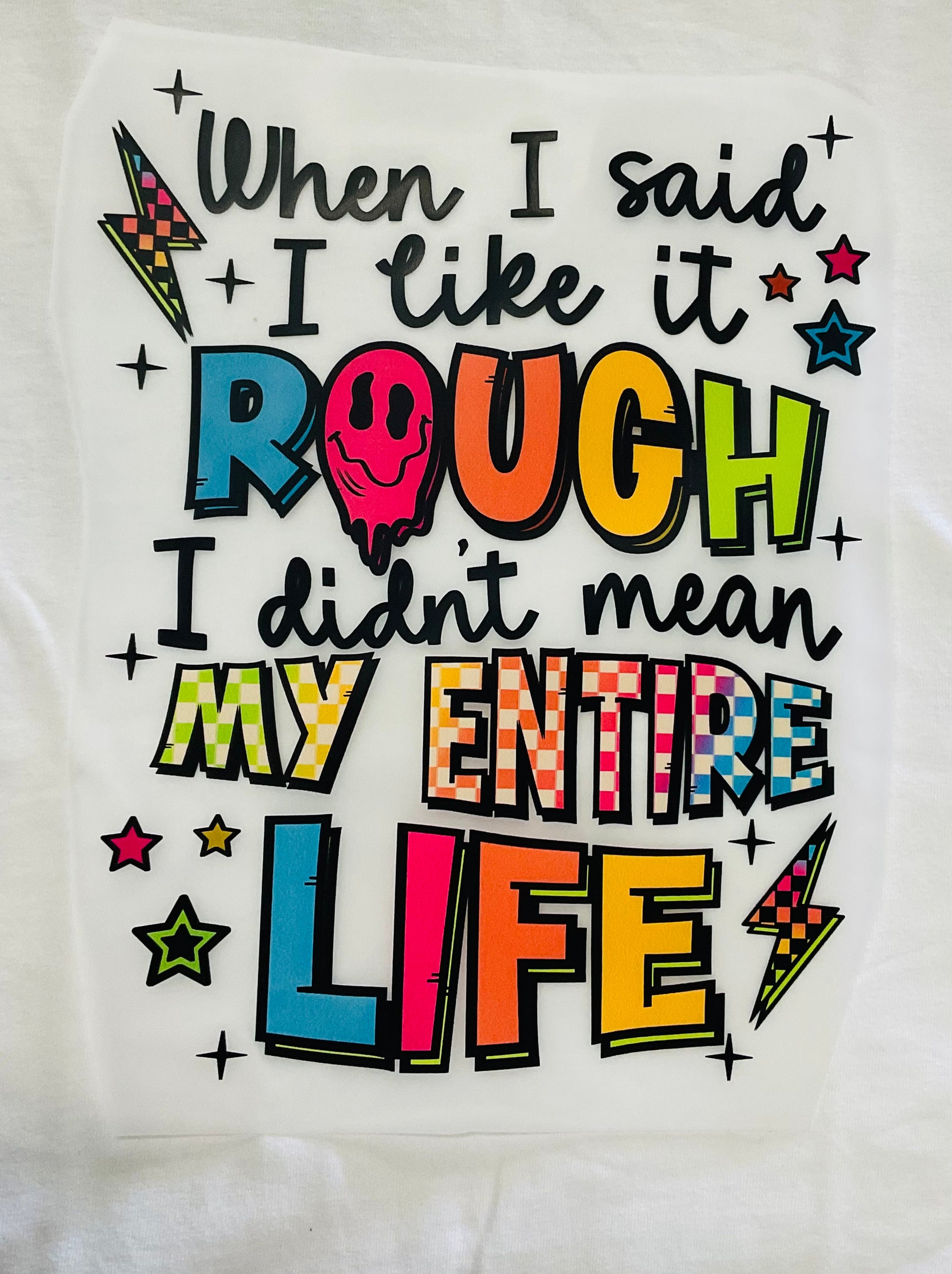 Introducing the Rough Life Tee, for those who like it rough (and soft)! This tee is perfect for everyday wear, with its comfy fabric and edgy style. Show the world that you don't take life too seriously with this playful and quirky tee. Made on a white tee.