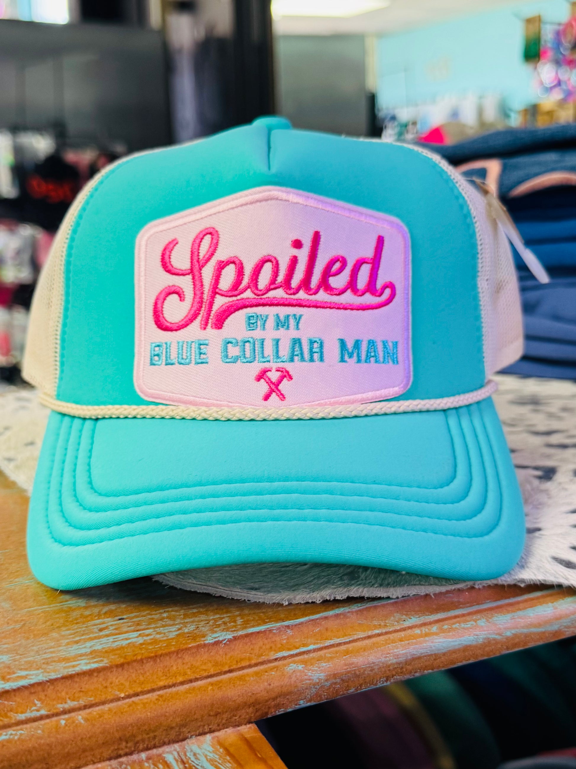 This Spoiled By My Blue Collar Man Trucker Hat is perfect for adding a touch of style to your everyday look. Made of high-quality materials, it offers a comfortable fit while showcasing your appreciation for blue collar workers. Show the world your pride with this unique and stylish hat.