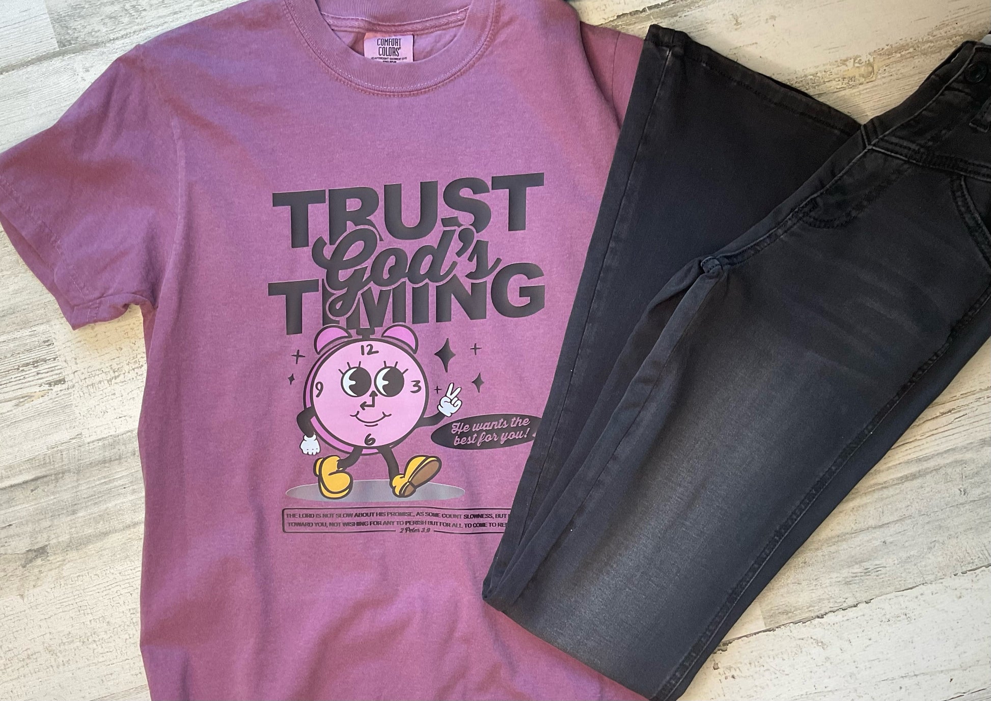 "Embrace the comfort and support of Trust God's Timing Graphic Tee. Remember that He wants the best for you, as stated in 2 Peter 3:9. Let this tee be a reminder to trust in His timing and have faith in His plan. Made with Comfort Colors, this tee is both comfortable and stylish."