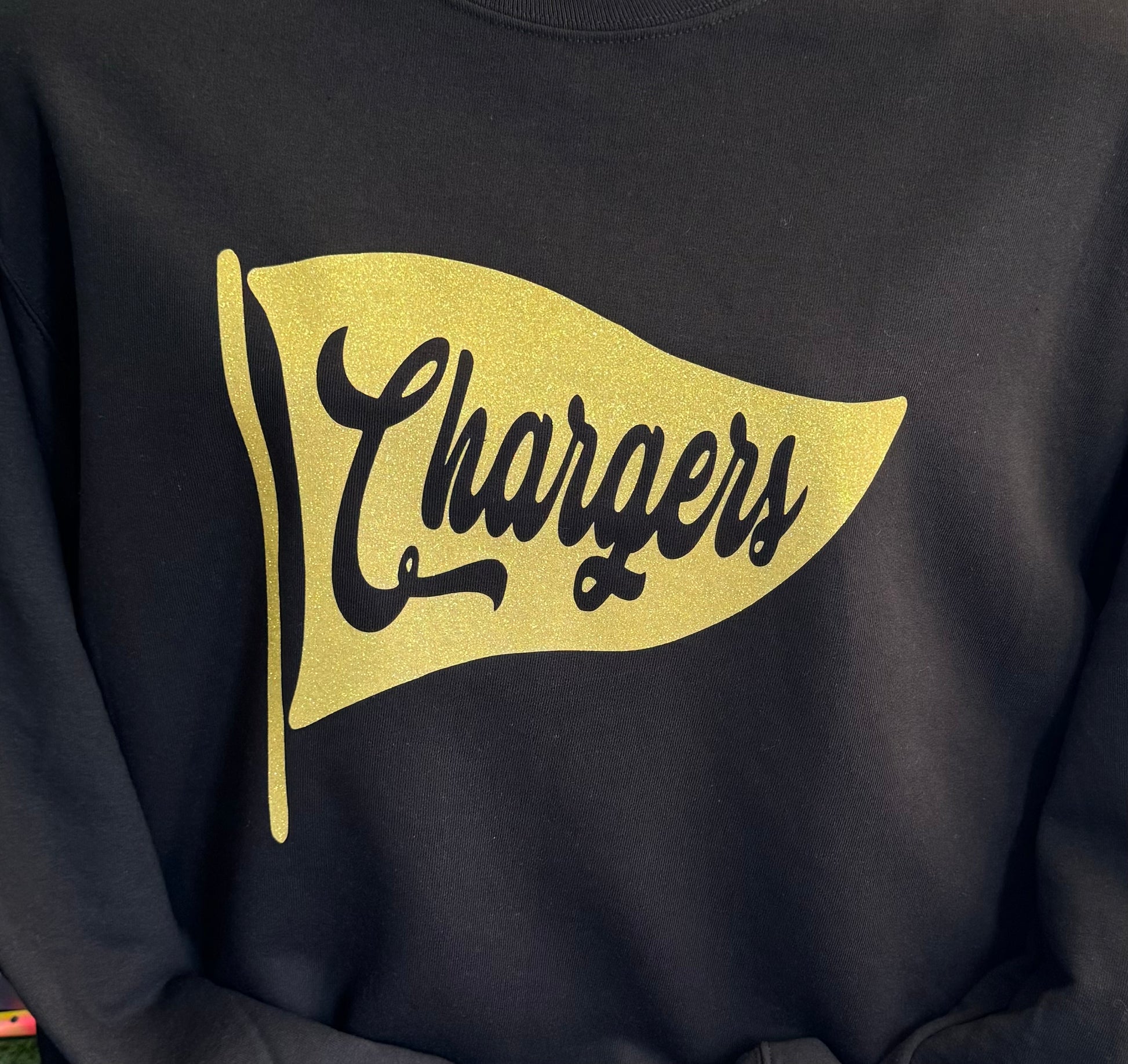 Introducing the Glitter Chargers Crewneck Sweatshirt. Show off your team pride in style with the sparkling Chargers glitter and unique pennant design. Made from high-quality materials, this sweatshirt offers both comfort and durability. Perfect for any Chargers fan or fashion enthusiast.